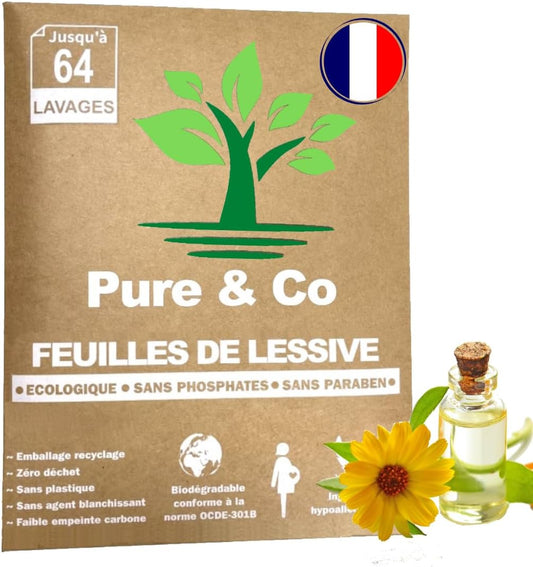 PURE & CO Lessive Feuilles Verte Ecologique, Bio, Bebe, Voyage, Machine à Laver, Main, Magique, Poudre, Hypoallergénique, Lingette, Concentrée, Parfum naturel Huiles Essentielles