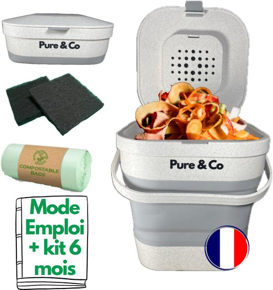 Pure&Co -Composteur Cuisine Pliable 4L -Poubelle Compost Table Déchet Alimentaire -Anti Odeur Couvercle+Filtre-Bioseau -Appartement Petit Plan Travail -Jardin -Recyclage -Kit Démarrage Offert